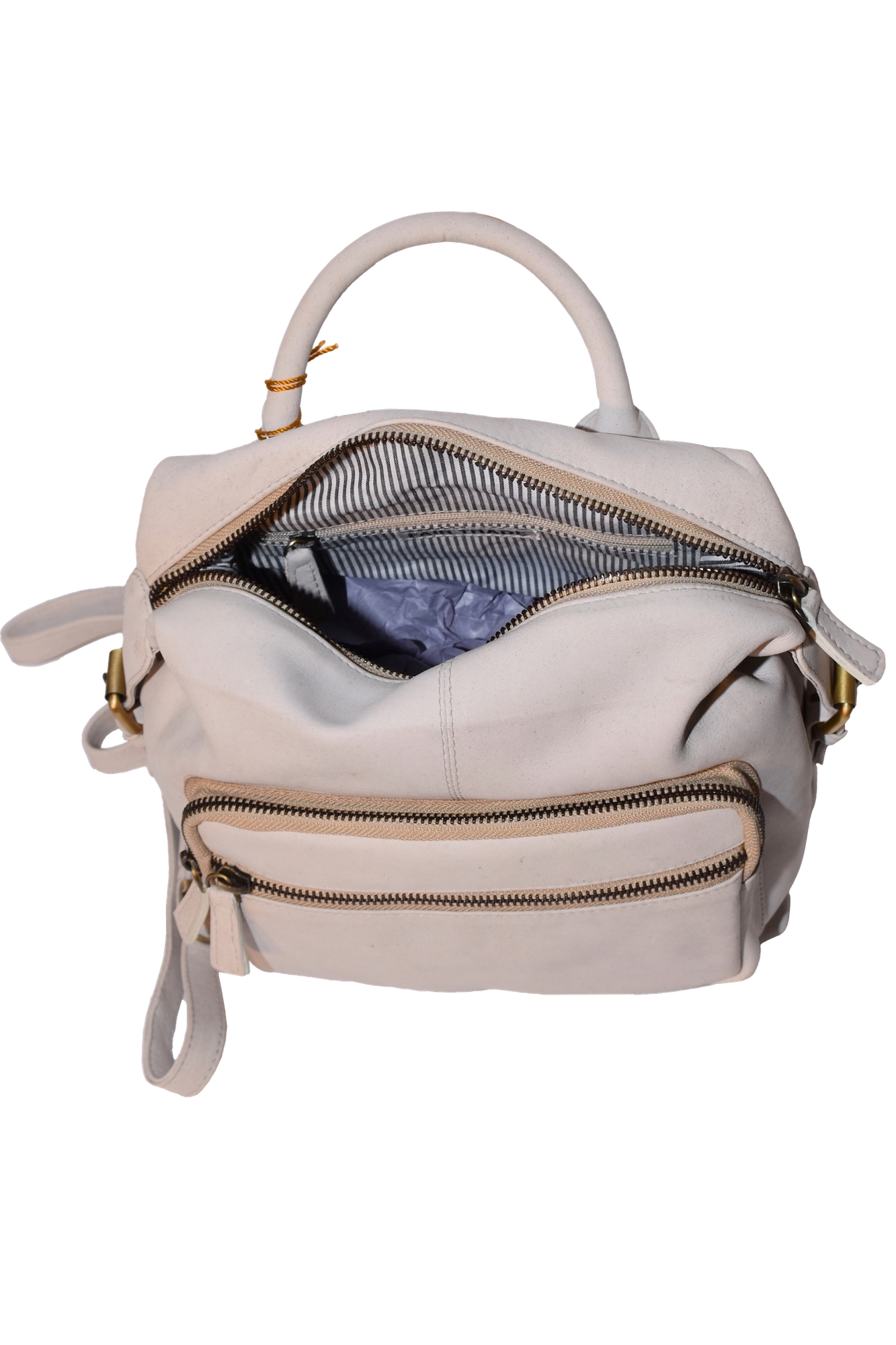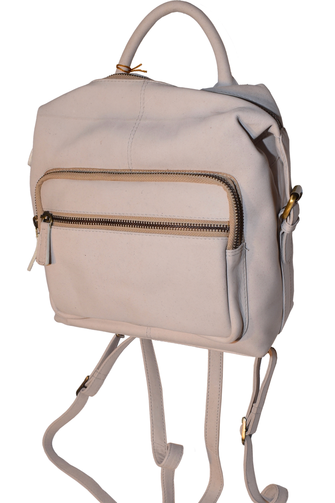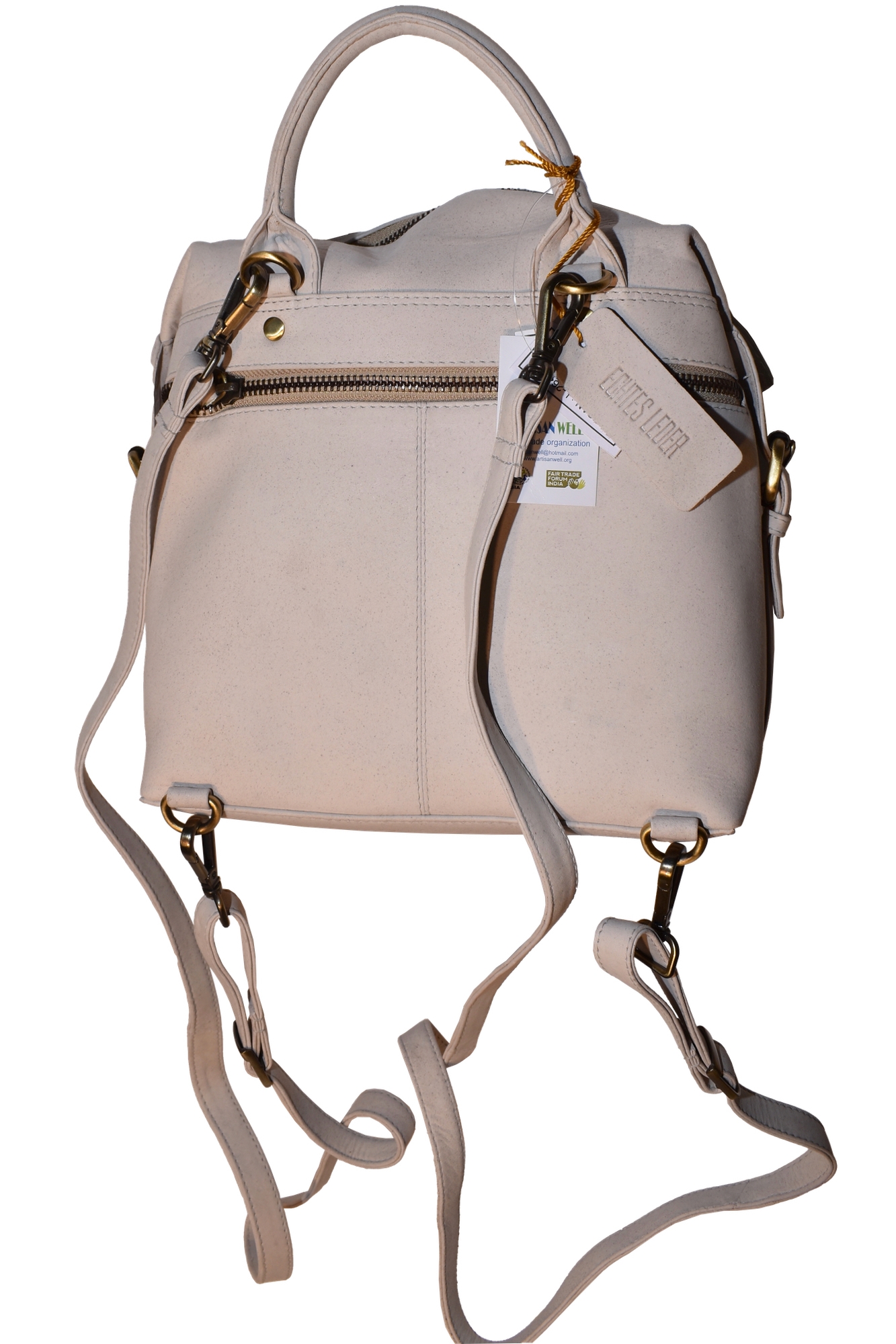 Dieser kleine Rucksack kann sowohl auf die Schulter genommen oder auch als Handtasche getragen werden. Das Hauptfach hat einen Reißverschluss. Vorne gibt es zwei weitere Reißverschluss Fächer und auch hinten ist noch ein Reißverschluss Fach. Im Innenfach ist ein weiteres Reißverschluss Fach integriert und natürlich auch ein Handy Fach.