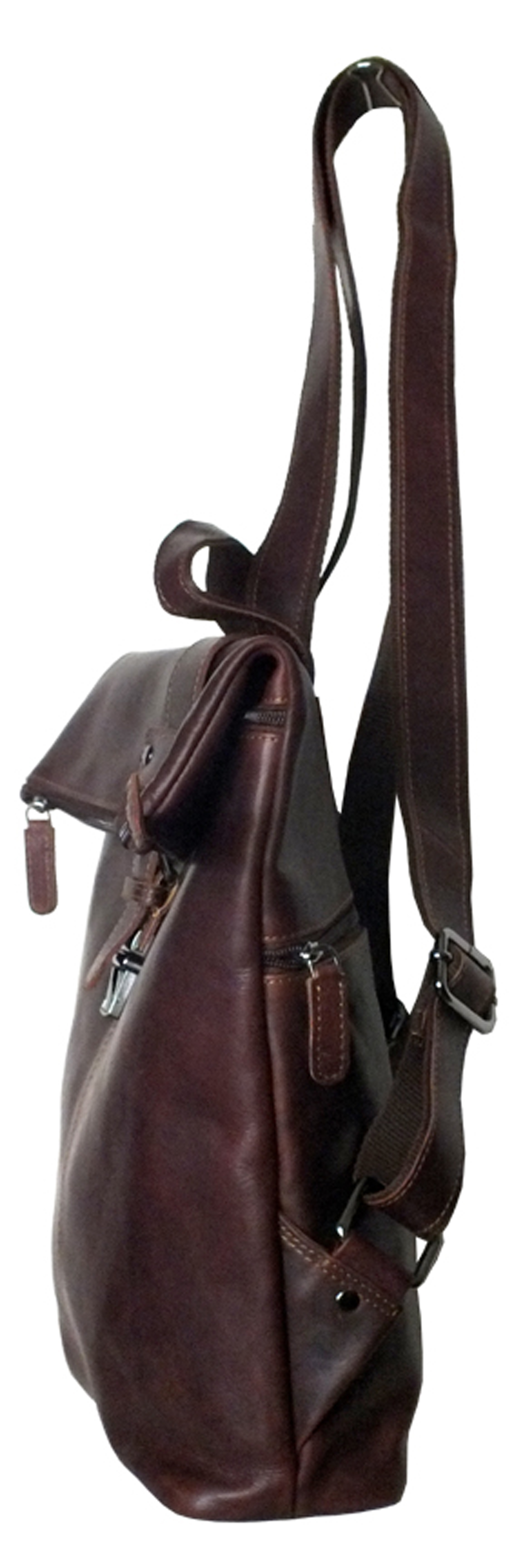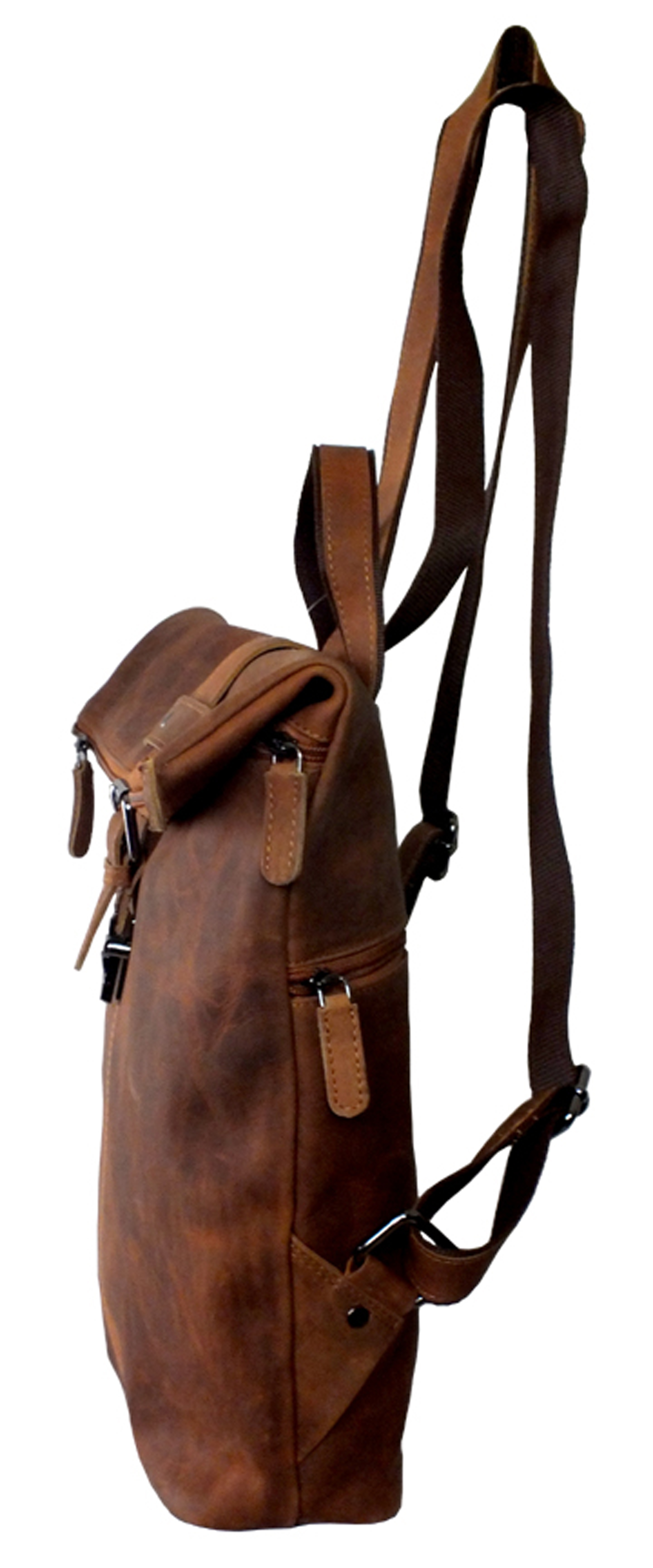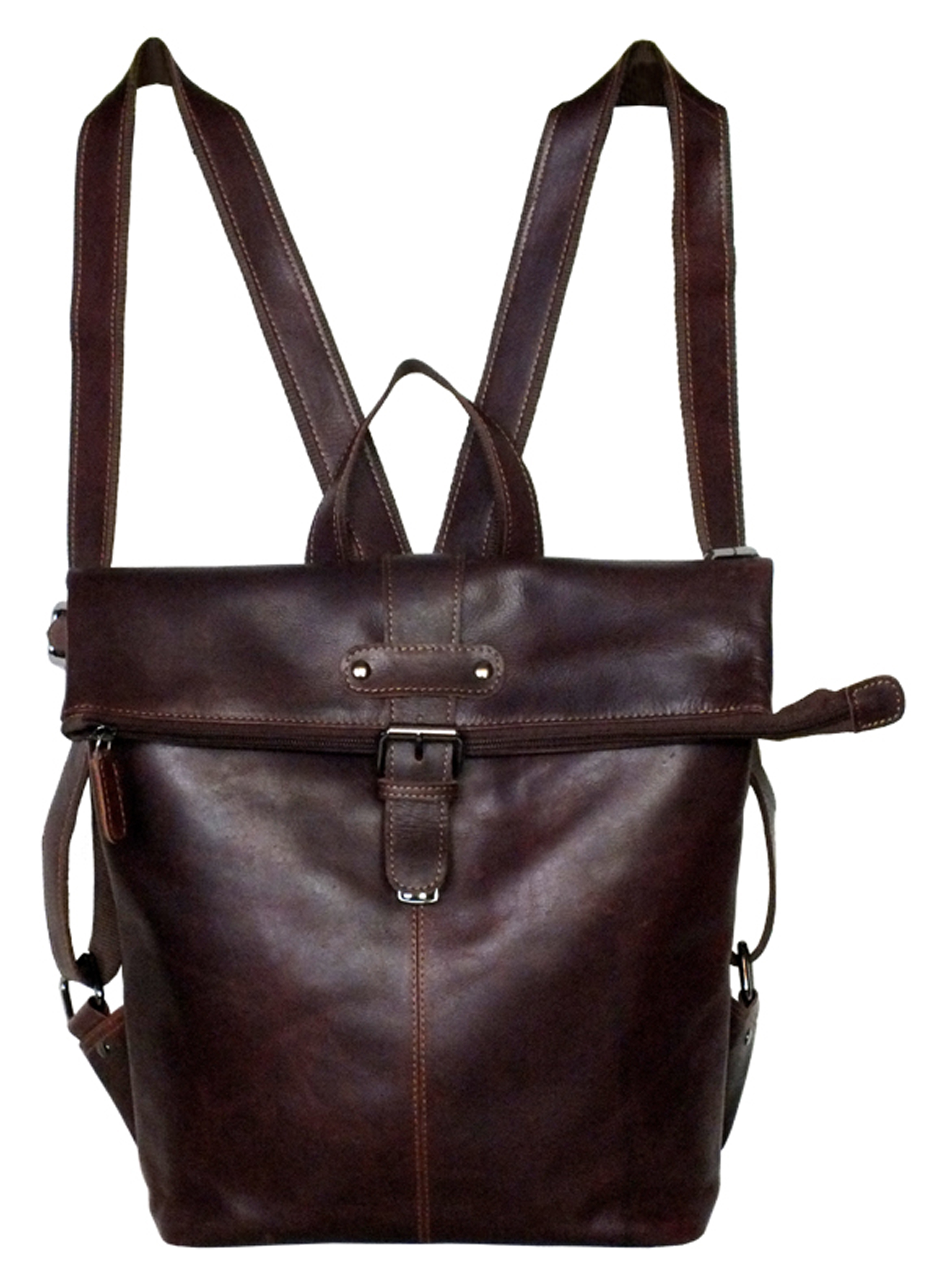 This rucksack is a special piece. Extremely stylish, it combines a messenger bag with a rucksack. It has adjustable straps. The zip top folds down and is secured with a satchel buckle. There is a zip compartment under the flap and at the back. Inside, there is a separate main compartment, two zip compartments, two small compartments for mobile phones, etc. and a few pen holders.