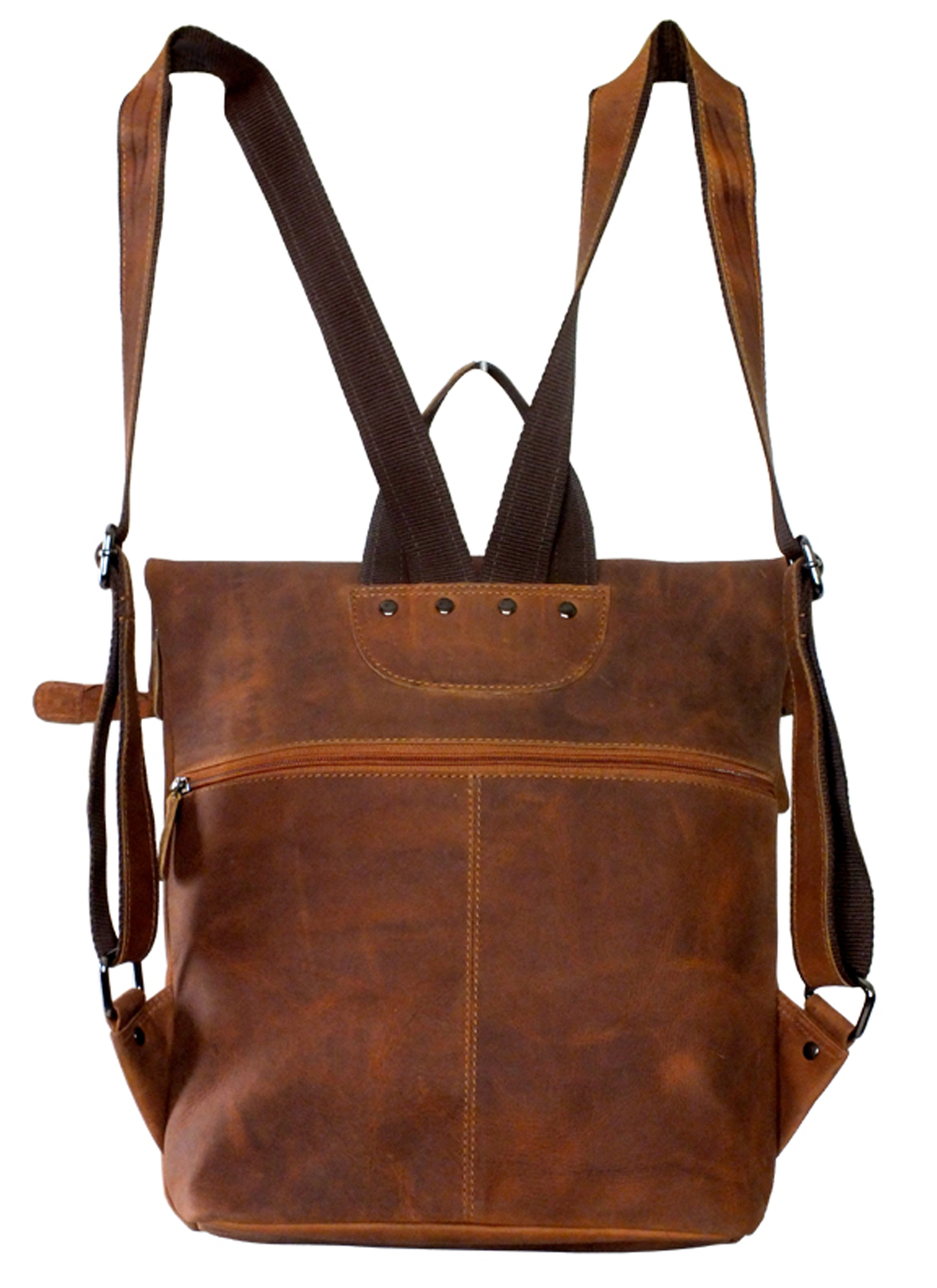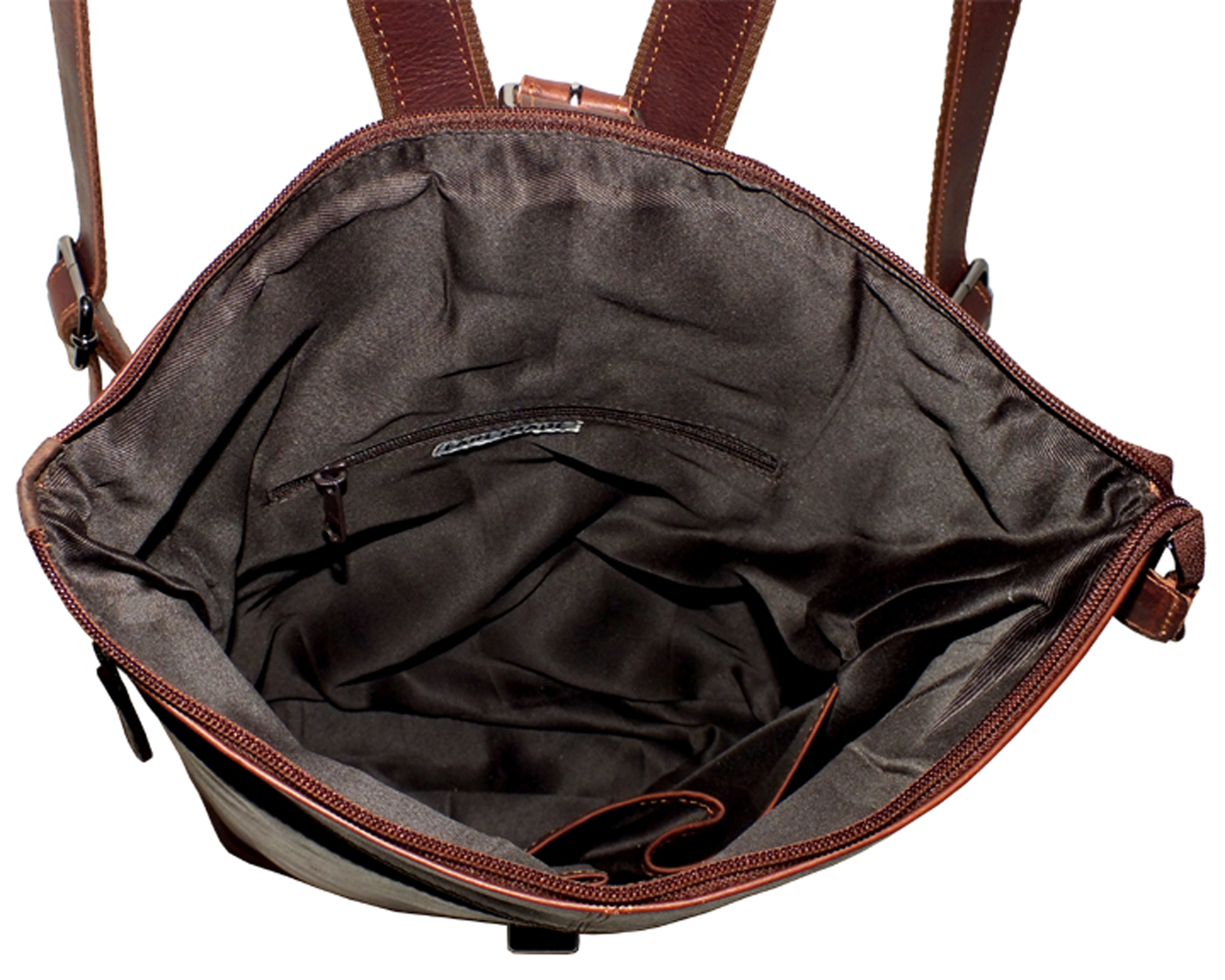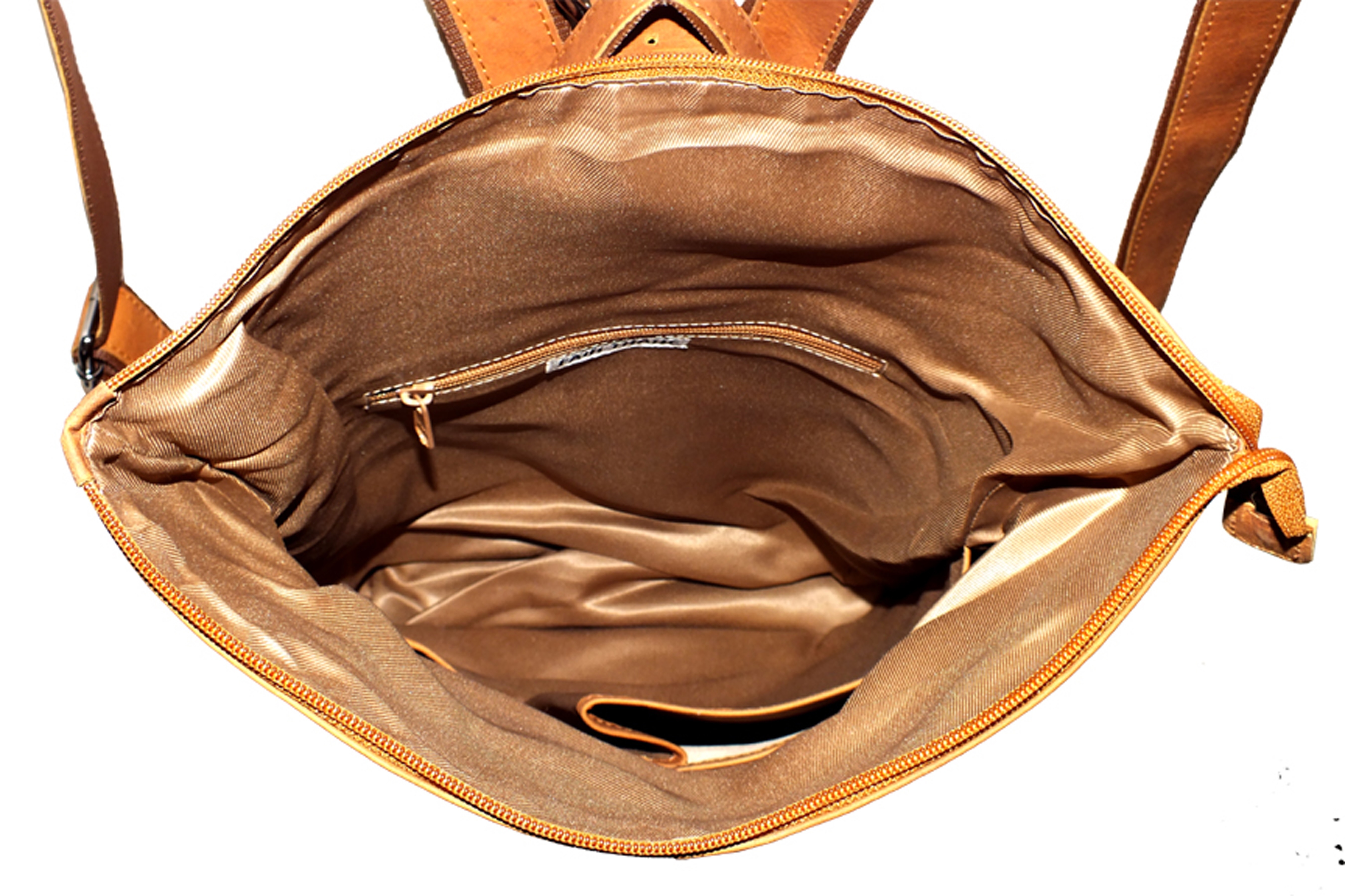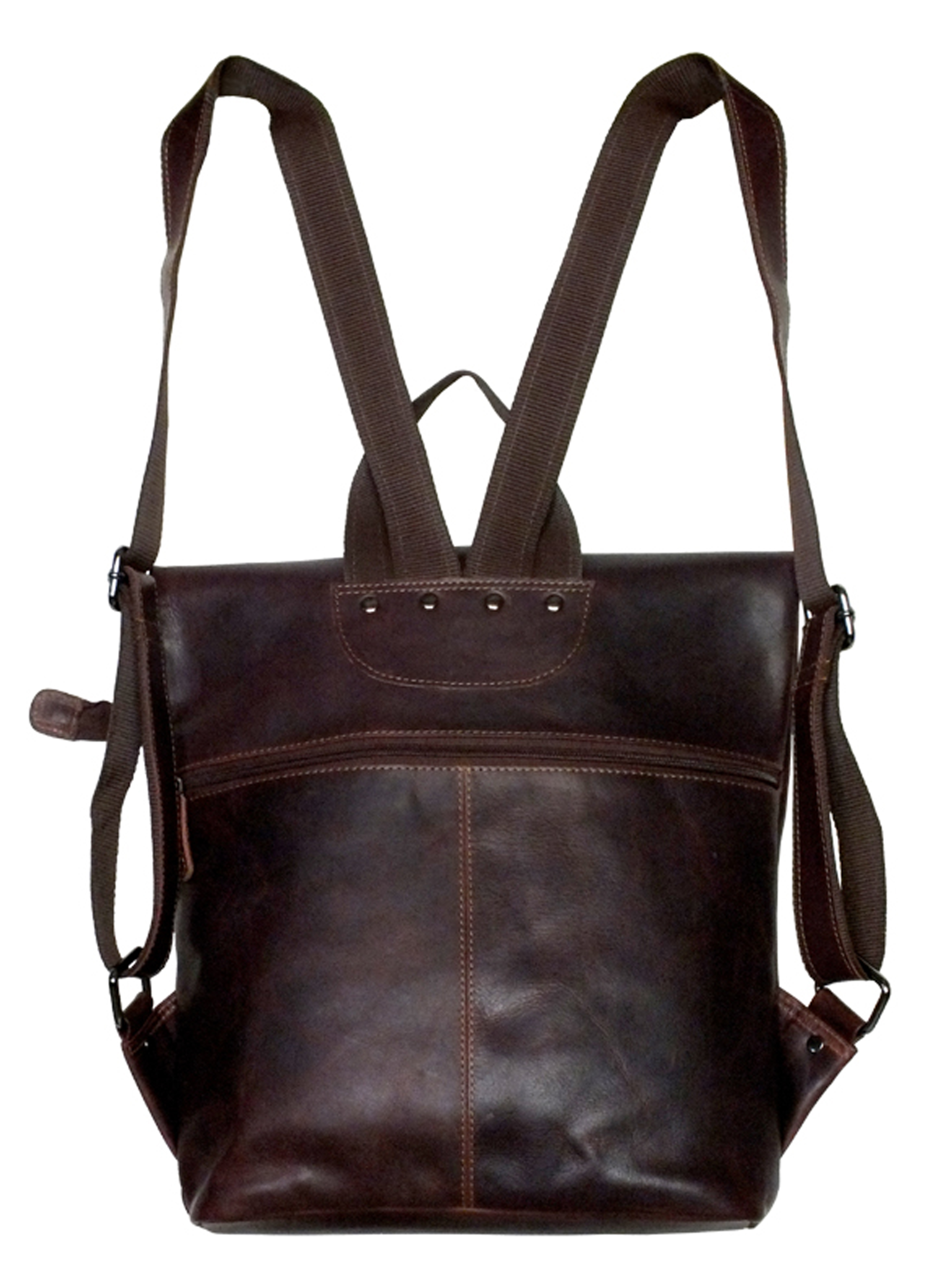 This rucksack is a special piece. Extremely stylish, it combines a messenger bag with a rucksack. It has adjustable straps. The zip top folds down and is secured with a satchel buckle. There is a zip compartment under the flap and at the back. Inside, there is a separate main compartment, two zip compartments, two small compartments for mobile phones, etc. and a few pen holders.